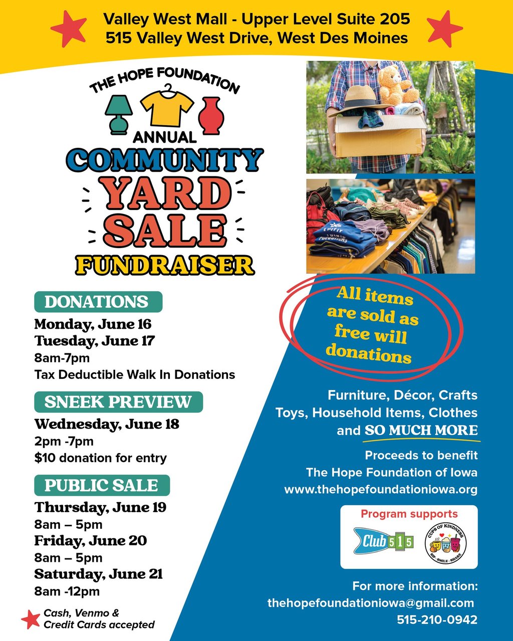 Funds from the yard sale will support Club 515 Activities and the purchase of our Cups of Kindness Food Truck, Millie